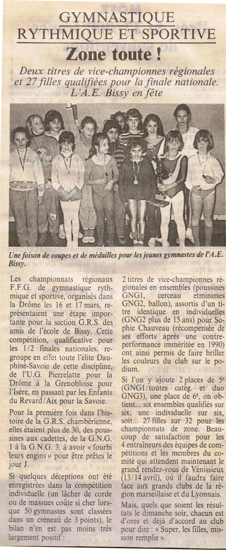 D’ailleurs cette année 1991 marque une nouvelle étape : une « grosse » qualification en championnat de zone Sud-Est FFGym, comme dirait le présentateur de « tout le sport » sur FR3 (et oui à l’époque, la chaine s’appelait comme cela…) : « ça, ce n’est pas rien ! »