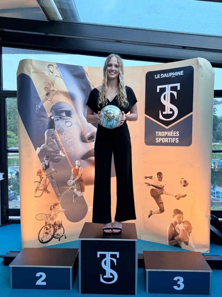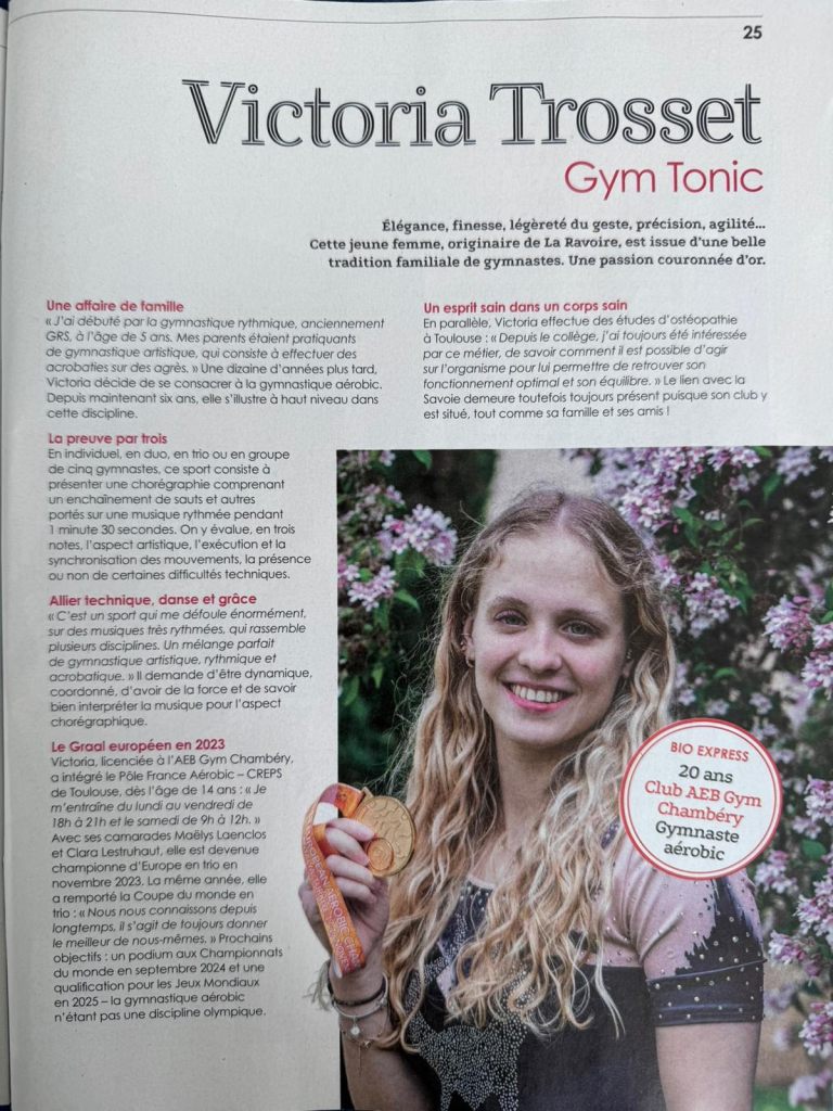 Victoria TROSSET , licenciée aux AEB GYM Chambéry et membre de l’Équipe de France de gymnastique Aérobic au pôle France de Toulouse , déjà élue sportive du mois de Novembre , était nominée pour le Trophée des Sportifs savoyards de l’année 2024.