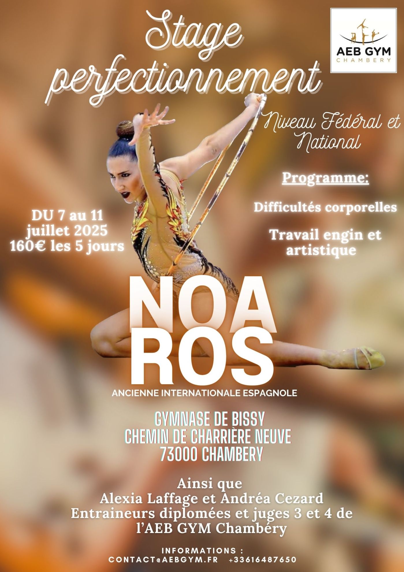 Les AEB organisent un Stage Perfectionnement GR pour les niveaux National et Fédéral la semaine du lundi 7 au vendredi 11 juillet 2025 avec la présence d’une ancienne gymnaste espagnole internationale: Noa ROS.
