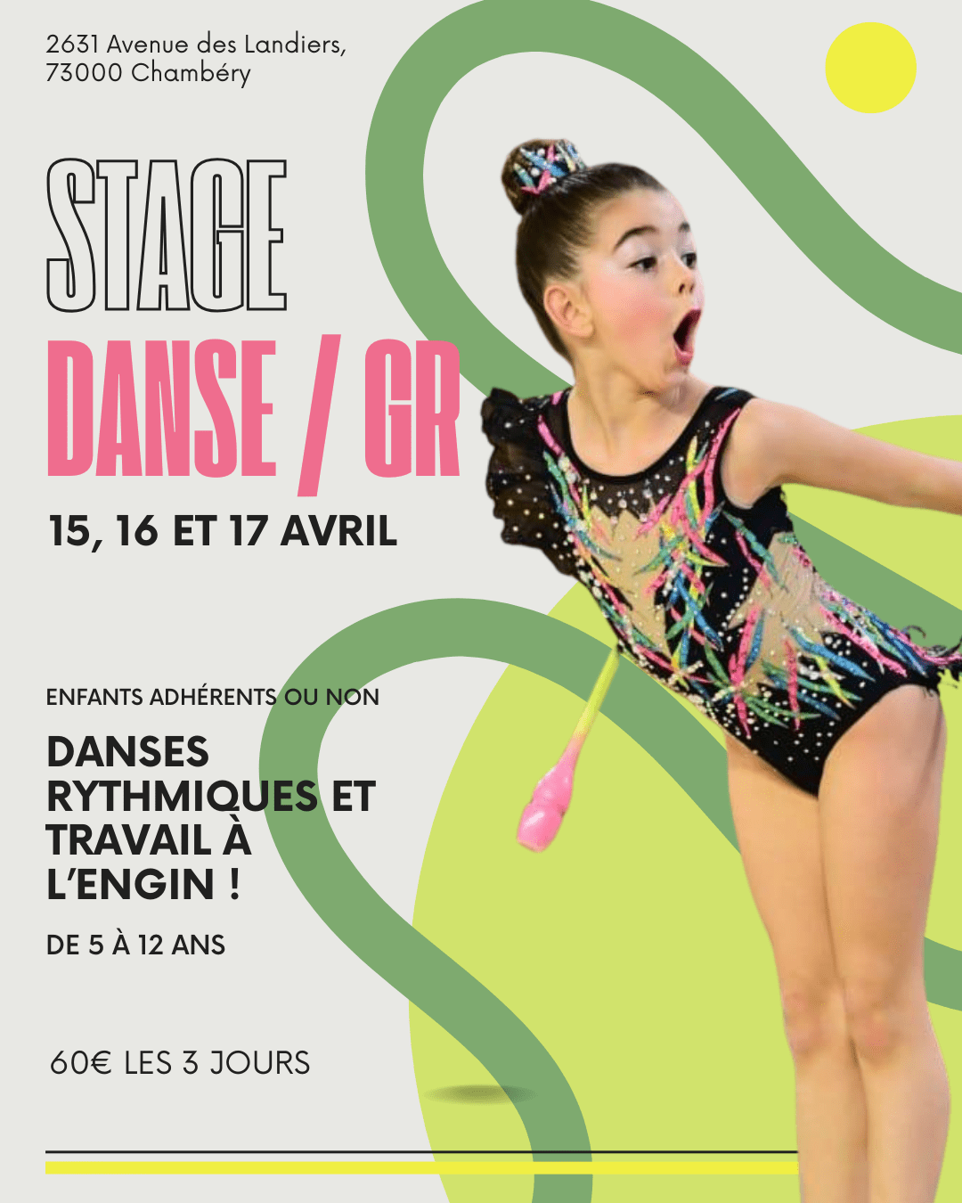 Nous organisons un stage de danse et de gymnastique rythmique spécialement conçu pour les enfants de 5 à 12 ans, adhérents ou non à l’AEB Gym les 15,16 et 17 avril 2026.